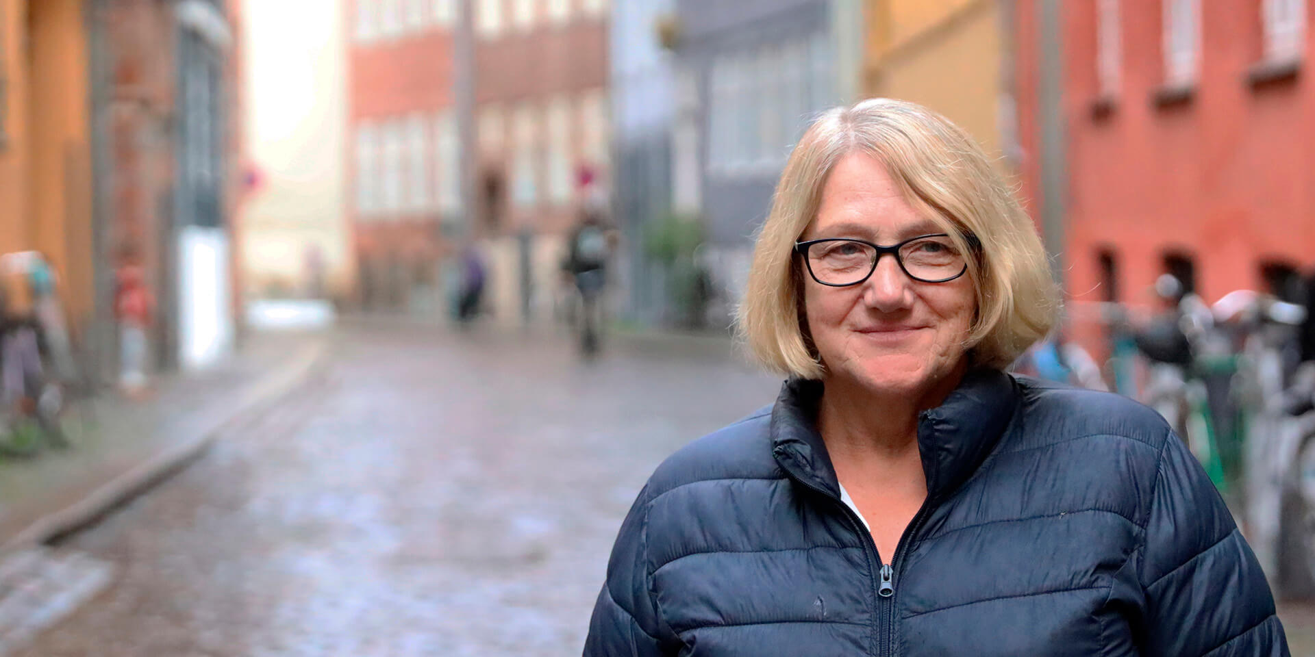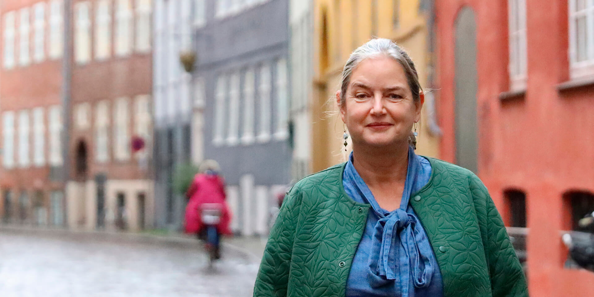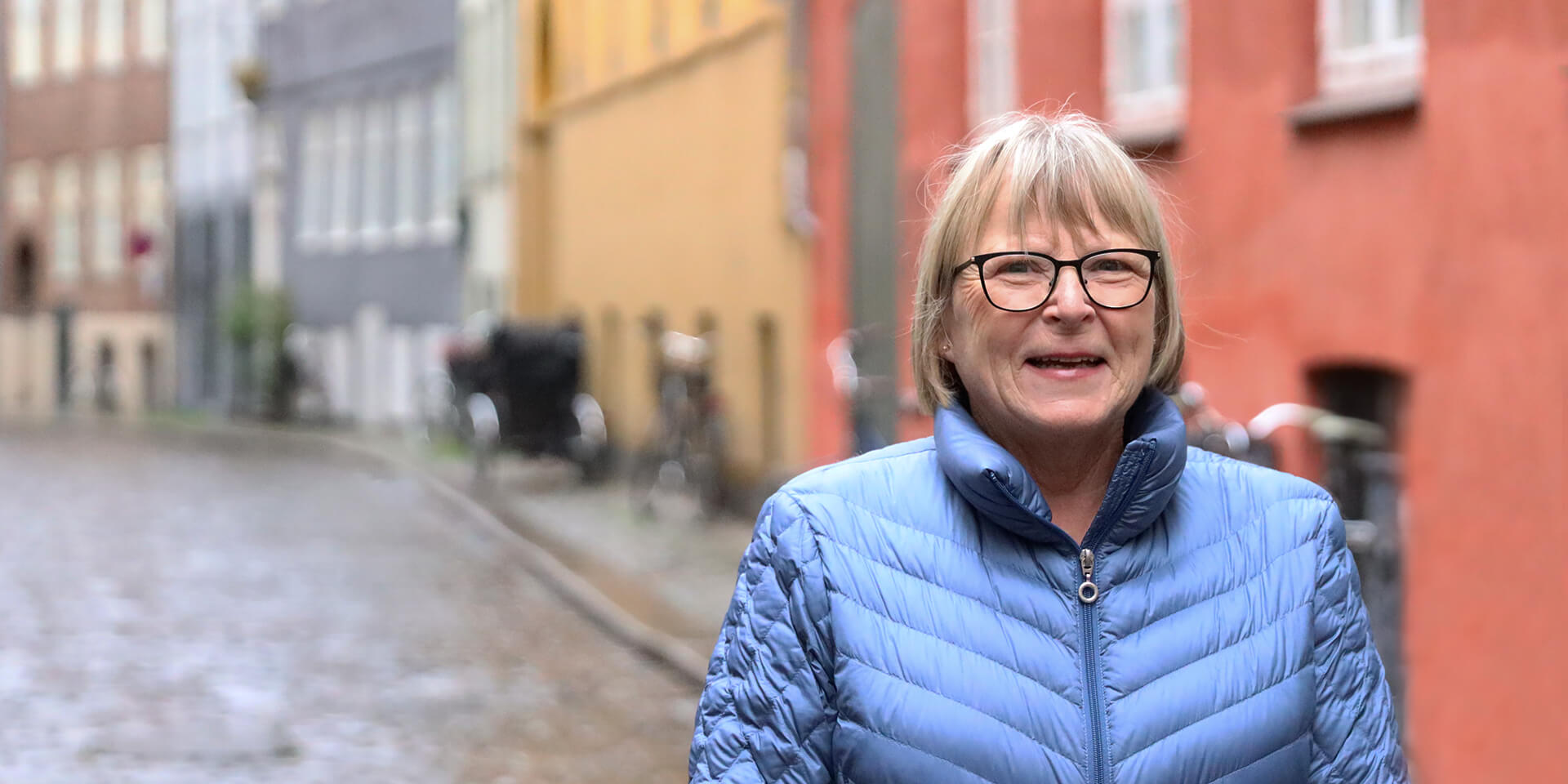 Dette er en hero section, med en stor overskrift. Den har ligeledes en hvis boks med sandfarvet baggrund